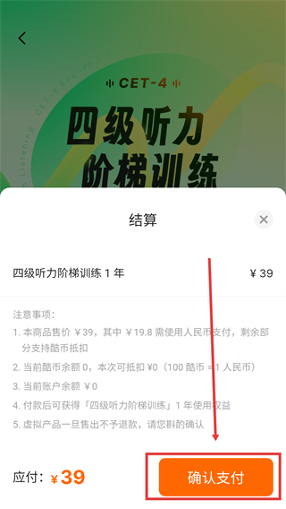 4、在【结算】页面确认价格为39元,点击【确认支付】完成开通。