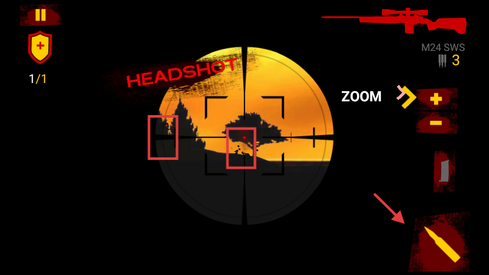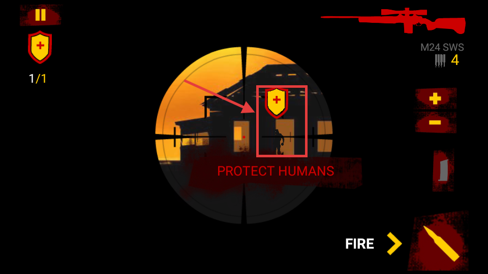 2、瞄准镜内识别带【+】盾牌的幸存者区域,优先射击靠近的僵尸,点击【FIRE】守护人类。