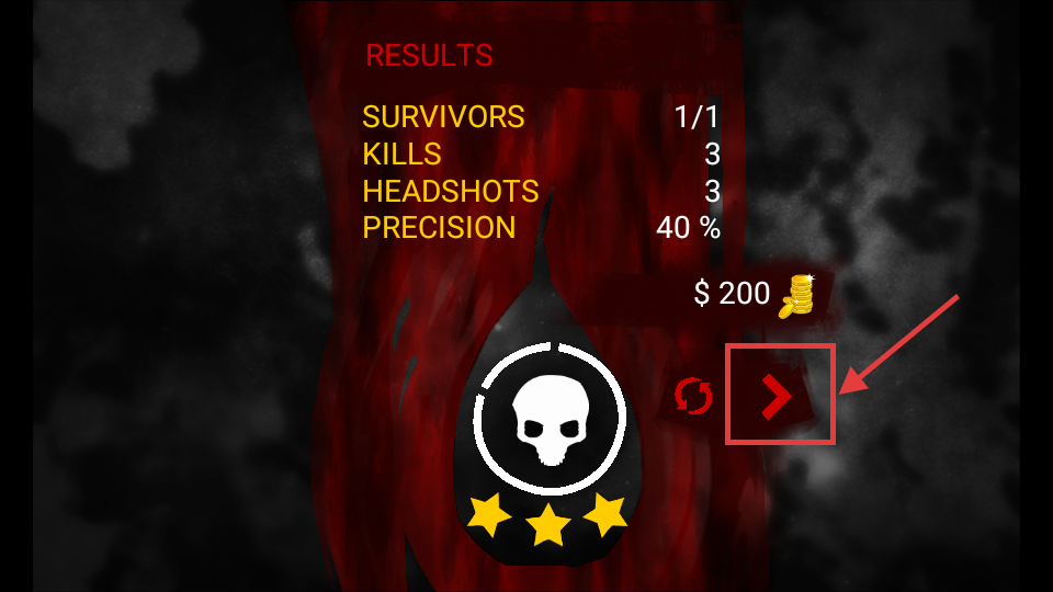 4、关卡结算后,点击红色箭头按钮,可进入下一关,继续挑战更多丧尸,积累战绩与金币。
