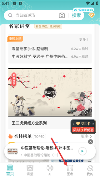 1、打开知源中医app,点击底部【医考】,进入医考板块呢。