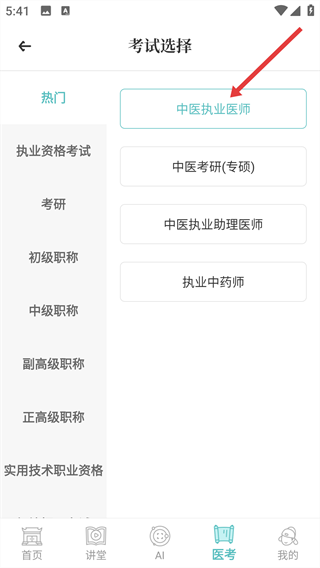 2、在考试选择界面,点击【中医执业医师】,明确学习方向,为中医备考找准目标哦。