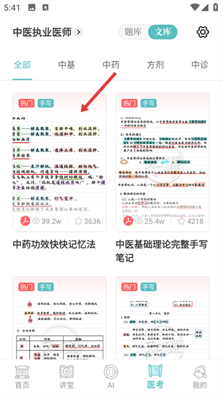 3、进入中医执业医师文库,选择【中药功效快快记忆法】等手写笔记,借助趣味记忆法学习中医知识呀。