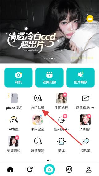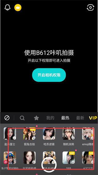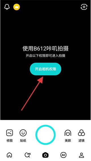 1、在主界面点击【热门贴纸】,进入拍摄页面后点击【开启相机权限】,获取拍摄权限。