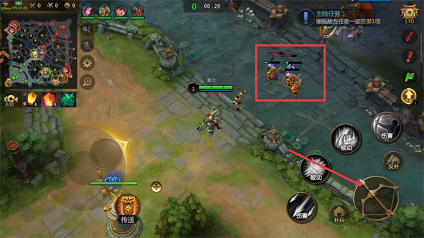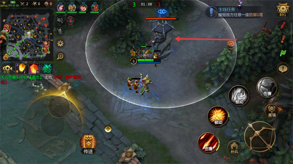 4、配合小兵攻击【防御塔】,摧毁敌方大本营。