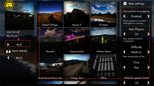 2、选定【Big-House】等地图后,点击【PLAY】即可进入关卡,同时可通过【Map-settings】调整玩家上限、难度等参数。