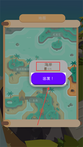 2、在【地图】界面选择【海岸】区域,点击【出发】按钮前往对应水域,开启新的垂钓冒险。