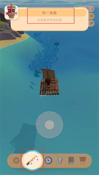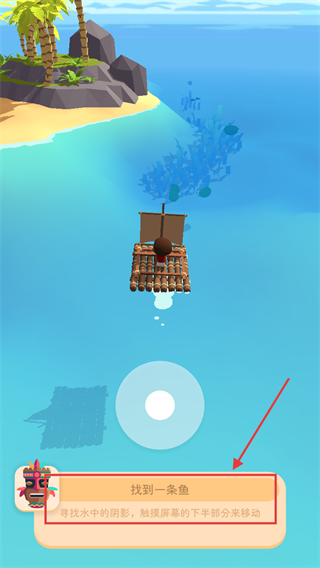 3、驾驶【竹筏】在水面移动,触摸屏幕下半部分调整位置,寻找水中阴影定位目标鱼类。