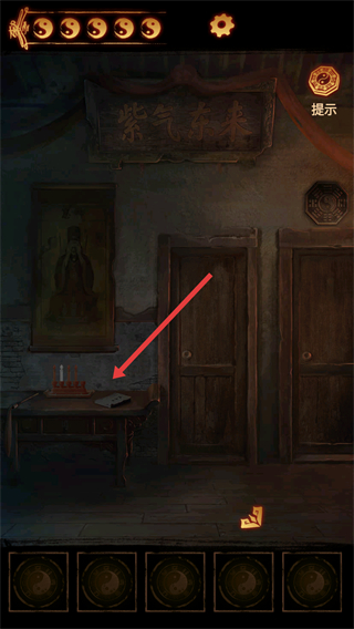 1、点击红色箭头指向的桌子区域,查看桌上的物品,寻找解谜线索。