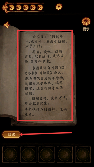 4、阅读红色框内的书本内容,了解风水术相关的知识,结合游戏场景中的元素,推进解谜进程。