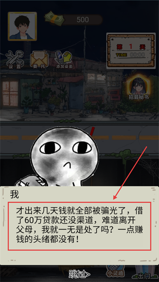 1、处理带感叹号标识的突发事件获取初始资金,这是偿还贷款与开启逆袭的第一步。