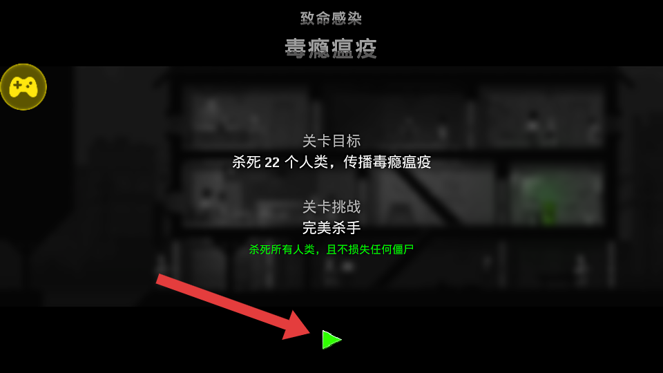 1、在【毒瘾瘟疫】关卡界面,明确目标是杀死22个人类并传播毒瘾瘟疫,点击绿色三角箭头开始挑战,利用无限道具优势推进。