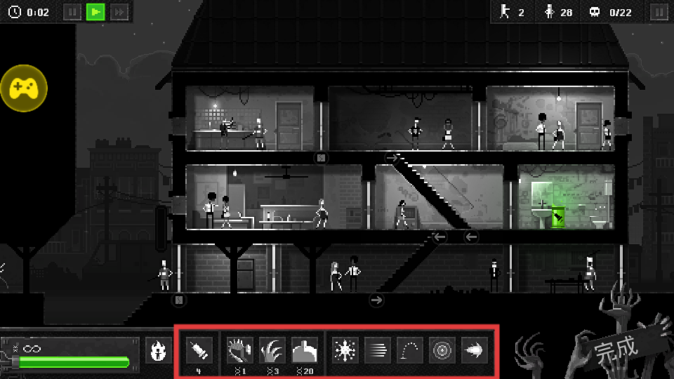 2、游戏中借助下方红色方框内的无限道具栏,选择合适道具,对场景内的人类发起攻击,高效感染。