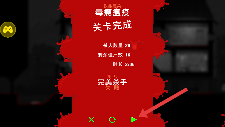 4、关卡完成后,点击绿色三角箭头,继续挑战新关卡,借助无限道具不断提升杀人数量和通关效率。