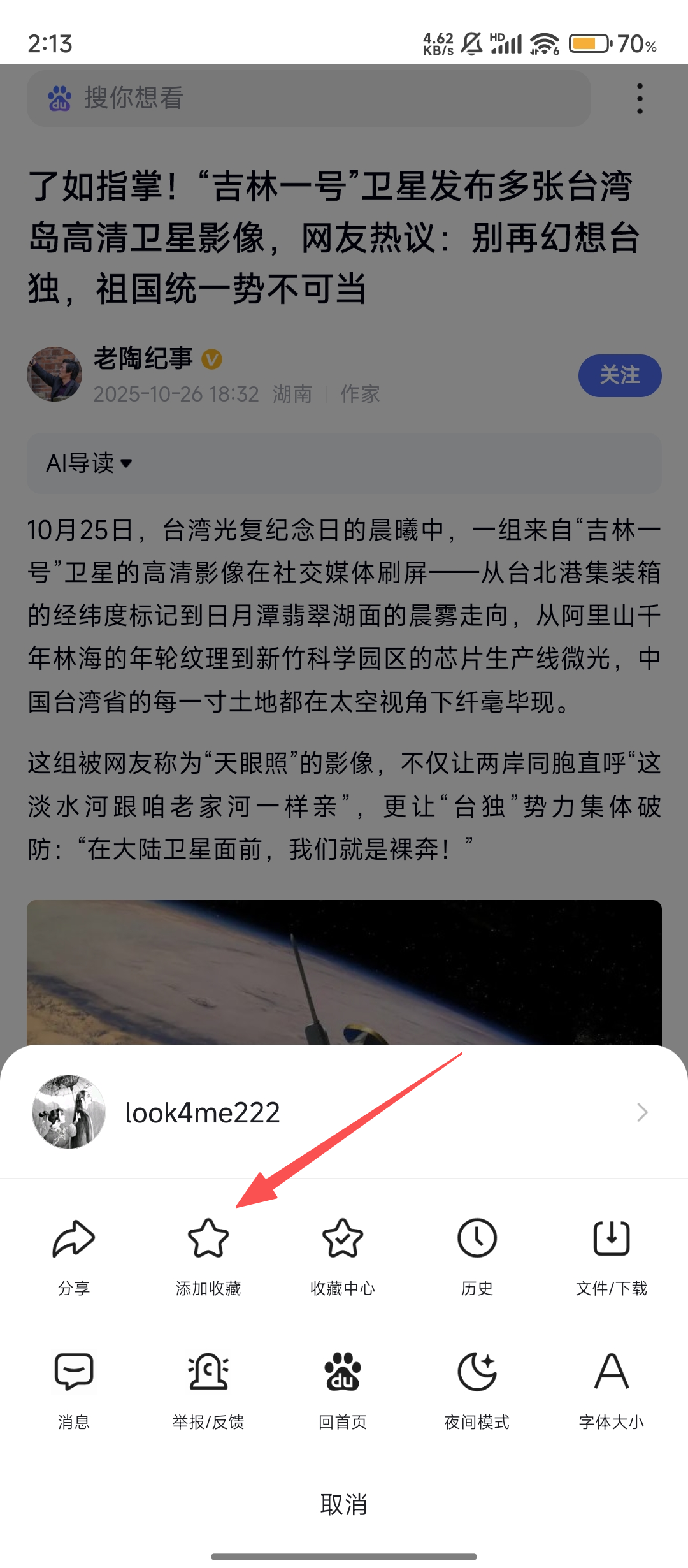 4、在展开的功能中,点击【添加收藏】,就能把该网页保存下来,方便日后查看哦。