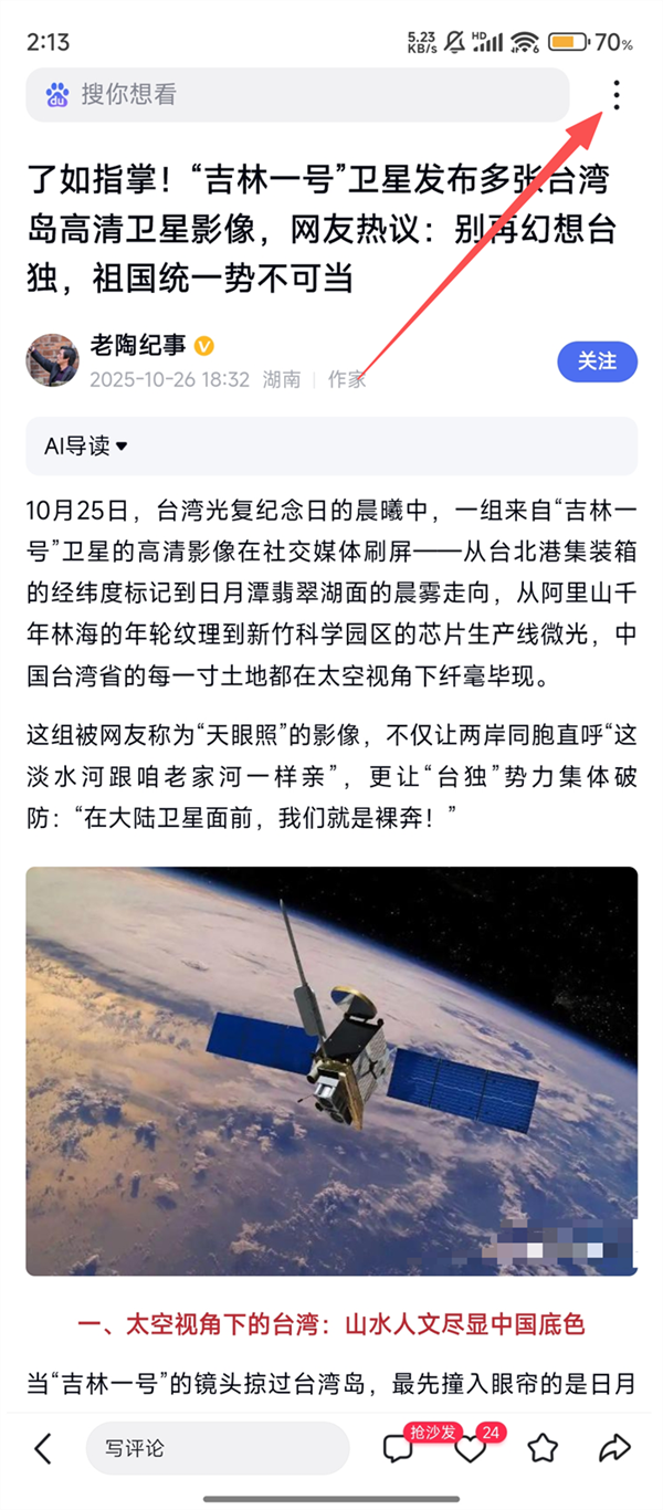 3、点击网页右上角的三点【菜单】按钮,展开功能列表,找到收藏相关选项。