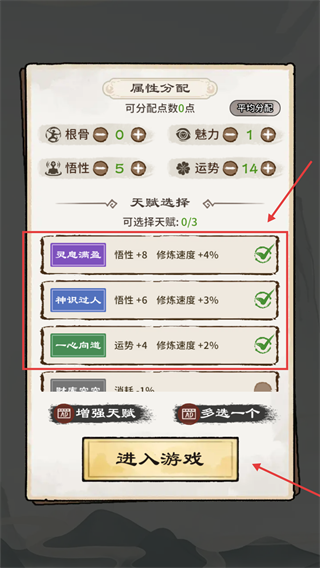 1、选择【灵息满盈】-【神识过人】-【一心向道】天赋,提升悟性与修炼速度,再点击进入游戏开启修仙。