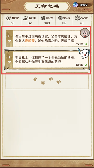 2、出身选江南书香世家,抓周礼选法器可加悟性,不同出身会触发不同修炼考验与支线剧情。
