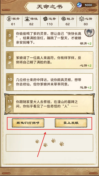 3、5岁喝灵茶加根骨,11岁祭祖遇怪人,选打招呼或蒙眼会影响后续属性与事件走向。