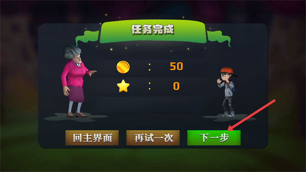 4、任务完成后获得【金币-50】,点击【下一步】进入新关卡,继续推进整蛊任务流程。