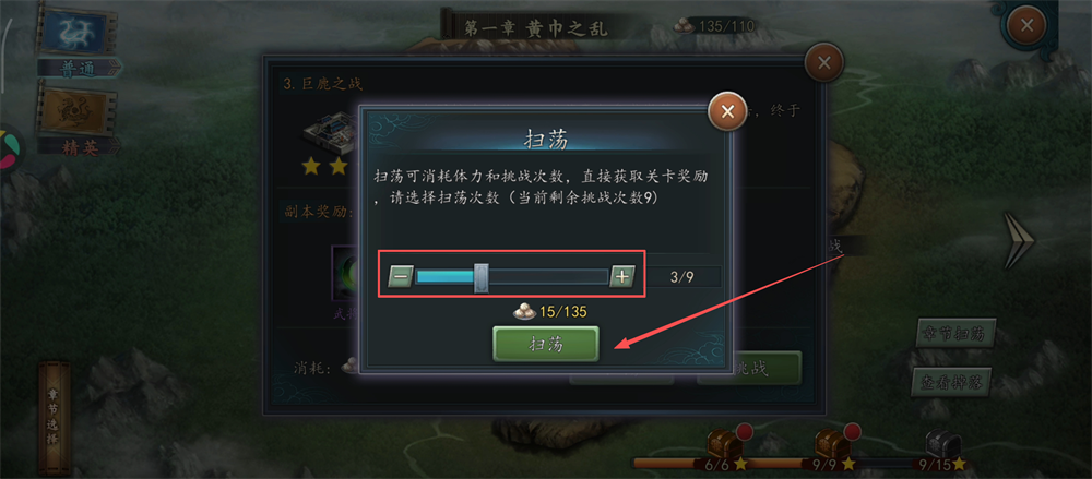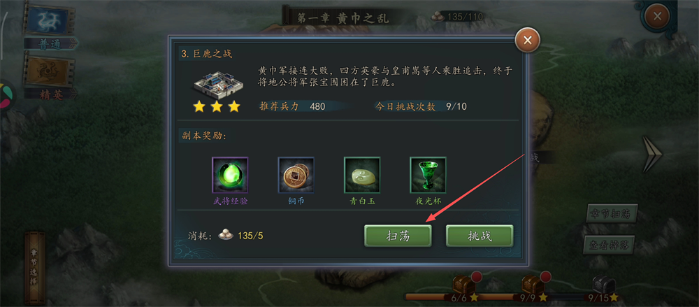 2、若完成【巨鹿之战】副本挑战,可以点击【扫荡】按钮,消耗体力快速获取【铜币】等奖励呢。