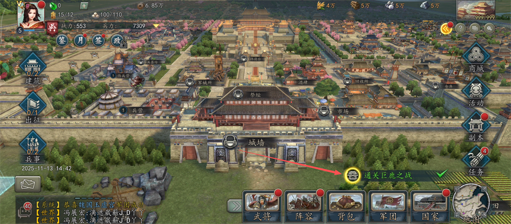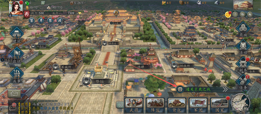 1、点击【通关巨鹿之战】进入副本,参与该副本可获取【武将经验】等奖励,有助于战力提升哦。