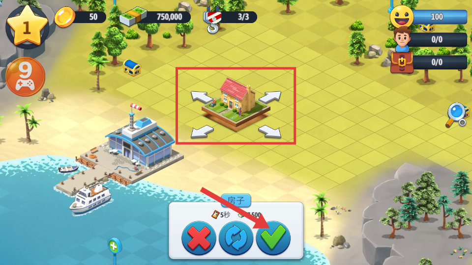 3、选择房子的放置位置,点击对勾确认,完成建筑放置。