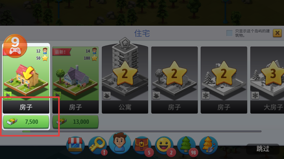 2、选择住宅类的房子,花费【7,500】建造,提升城市居住设施。