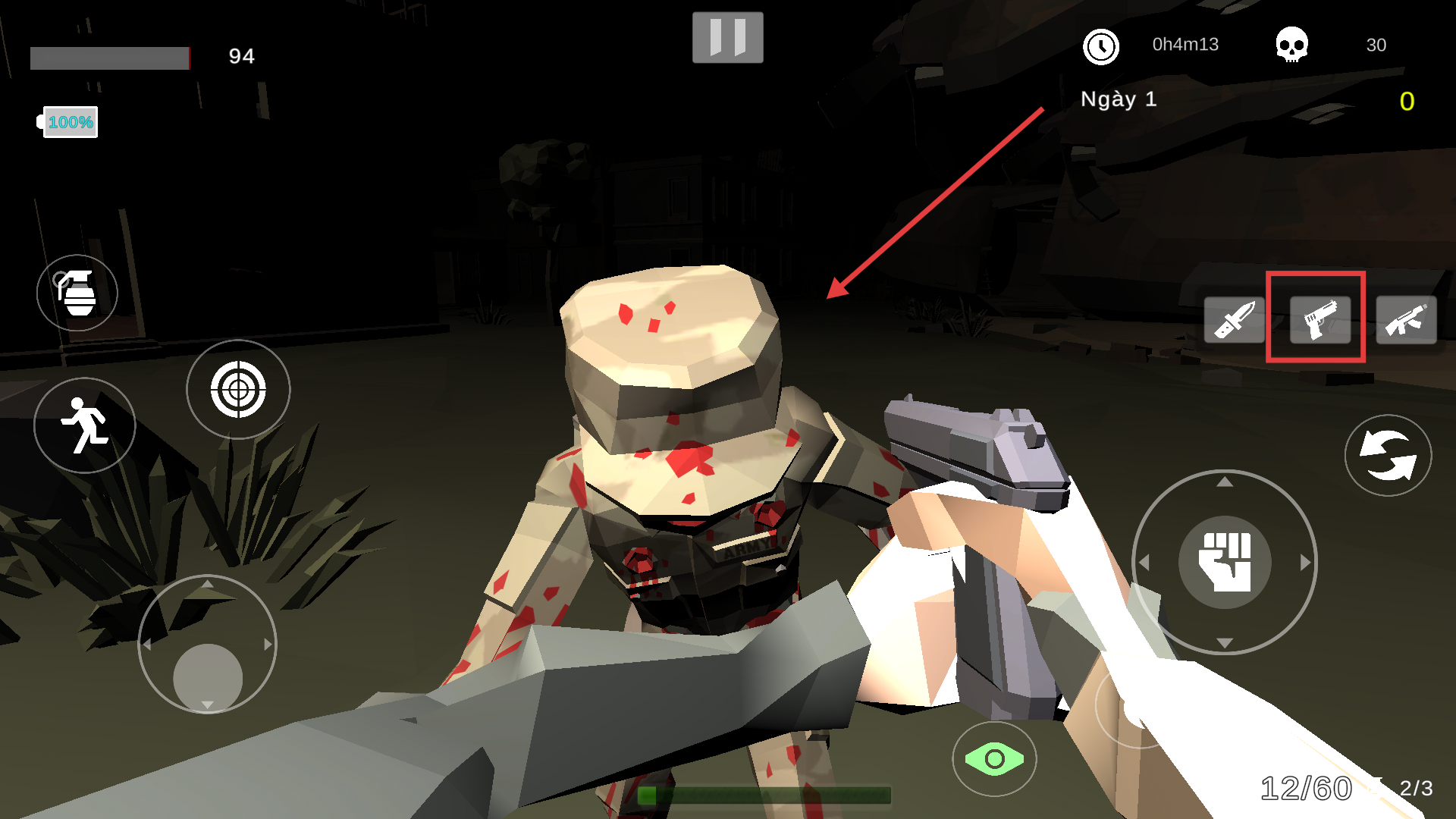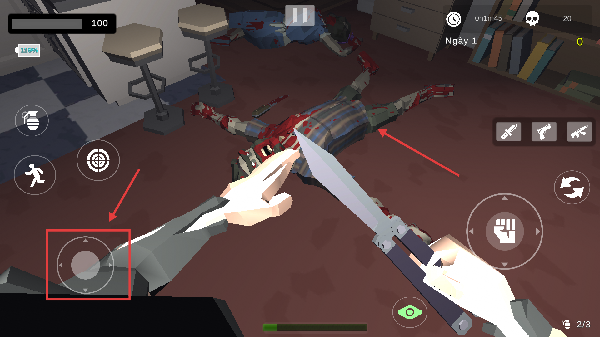 2、用左下角【移动摇杆】控制角色移动,遇僵尸时用近战武器攻击,可切换右侧【武器】栏装备。