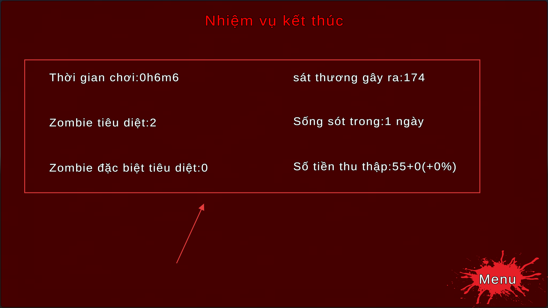 4、任务结束查看【时间】-【击杀数】-【存活天数】统计,点【Menu】返回菜单准备再战。