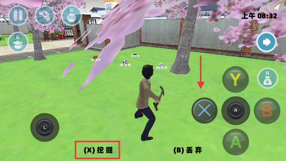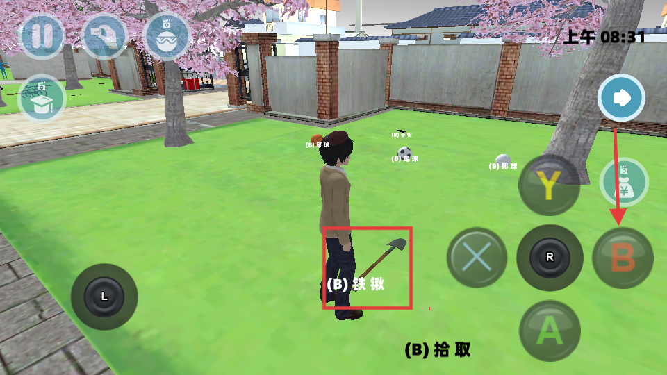 2、在草坪场景看到【(B)铁锹】时,按下B键拾取,获得工具后可用于挖掘或战斗,提升互动和战斗能力。