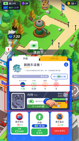 3、招募景点经理(如内特,具有弹跳者技能),提升游乐设施的运营效率和收益水平,优化游乐园的管理团队。