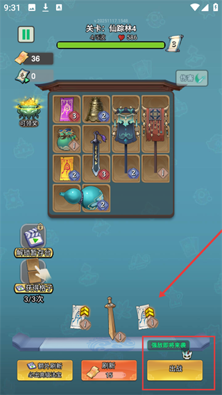 1、在【仙踪林4】关卡中,提示强敌来袭时点击底部【出战】按钮,派出已准备的法宝应对第4/5波敌人。