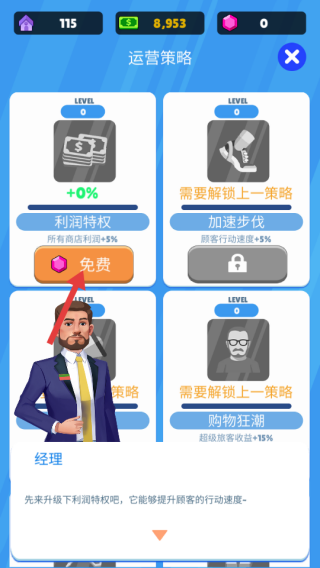 4、点击【免费】解锁利润特权,提升所有商店利润,优化商场运营收益。