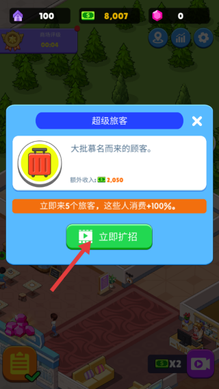 2、点击【立即扩招】获取5个超级旅客,提升商场收益。