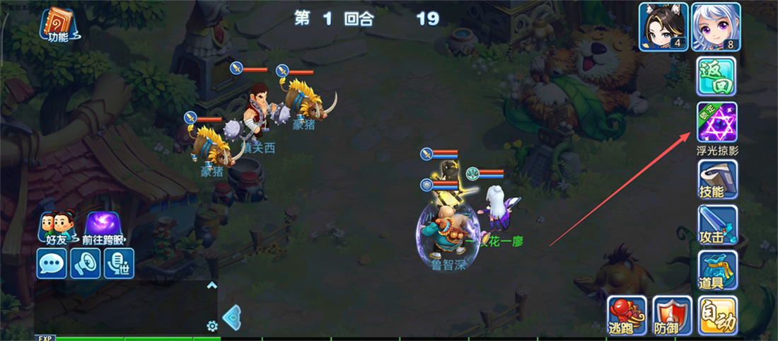 3、在神兽回合,选择【浮光掠影】技能,借助其效果提升战斗输出能力。