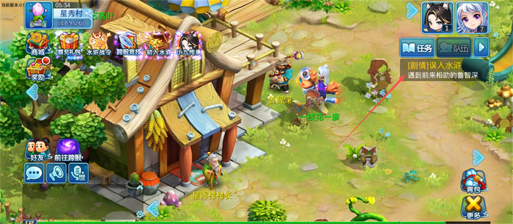 1、点击【任务】面板,接取【误入水浒】任务,与鲁智深互动,推进剧情准备战斗。