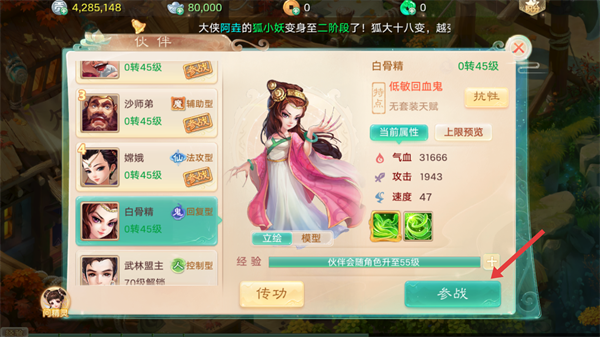 4、招募完成后,点击【参战】,让伙伴加入战斗,提升整体战力。