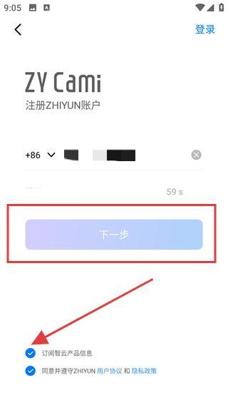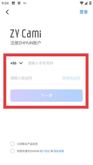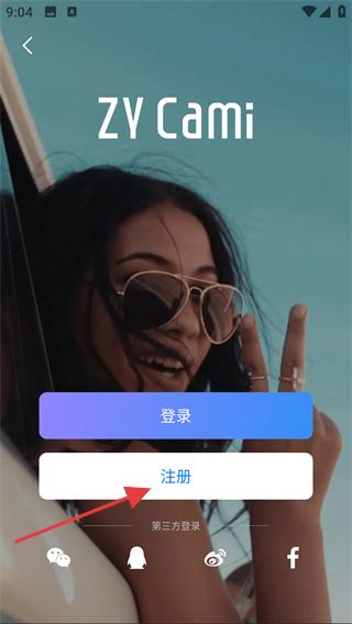 2、选择【注册】,可开启ZY-Cami的账户注册流程。