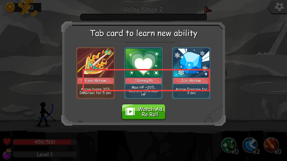 2、选择新能力卡,如【Fire-Arrow】【Strength】【Ice-Arrow】,学习新技能提升战力。