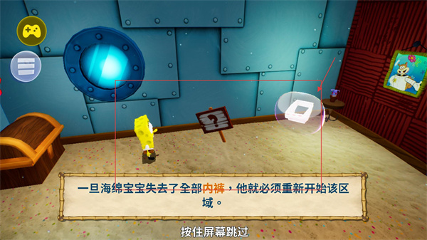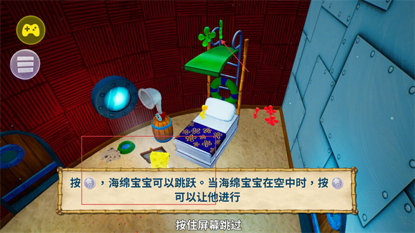 1、按【跳跃键】控制【海绵宝宝】跳跃,在空中再次按该键可触发额外动作,完成后按住屏幕跳过提示继续探索。