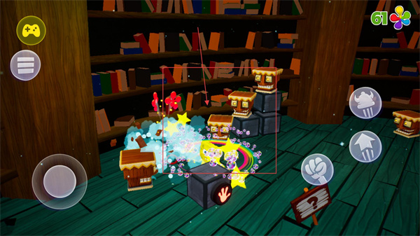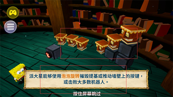 3、操控【派大星】使用【泡泡旋转】技能,可摧毁【提基】、推动按键或击败机器人,按住屏幕跳过提示后执行对应操作。