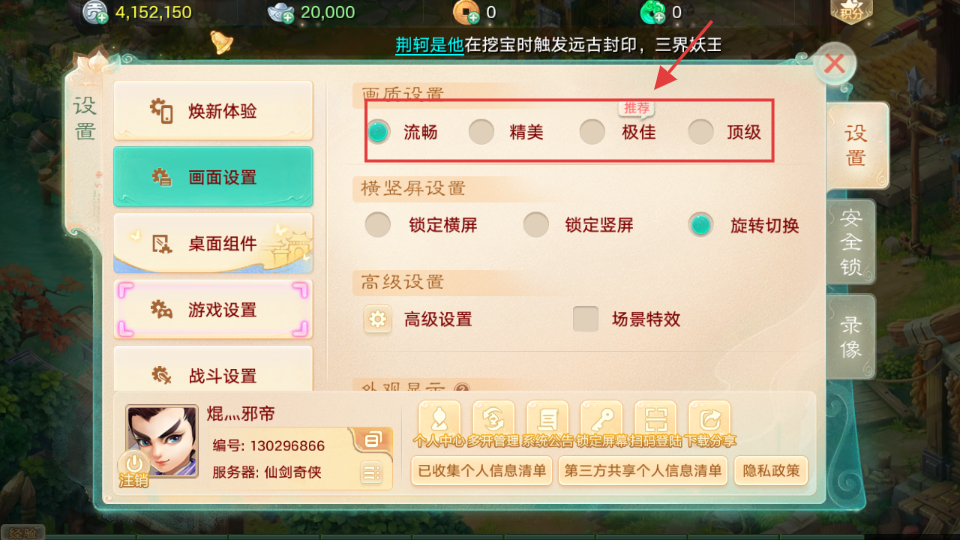 3、在画质设置中,有【流畅】【精美】【极佳】【顶级】四个选项,可根据设备性能选择。