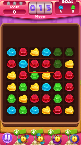 2、在消除界面,优先消除相邻的同色糖果,如红色糖果,积累分数,朝着目标糖果数量努力。