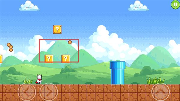 1、操控角色跳跃触碰【?】方块,触发方块掉落并收集弹出的金币,同时规划路线避开障碍。