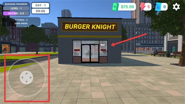 1、在【DAY-1】场景,操控红框内的方向键移动角色,前往【BURGER-KNIGHT】店铺,开启经营流程。