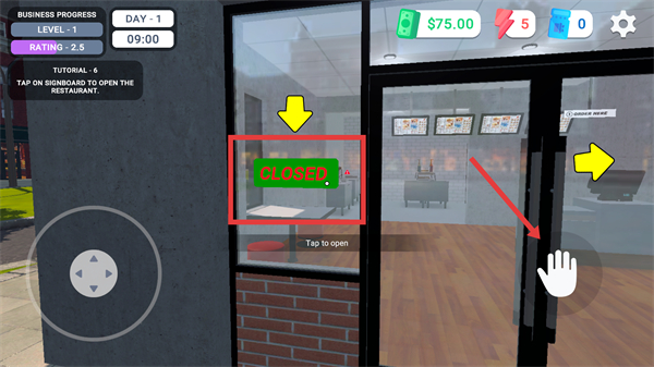 2、按【TAP-TO-OPEN】提示,点击红框内的【CLOSED】标识,打开店铺门进入经营场景。