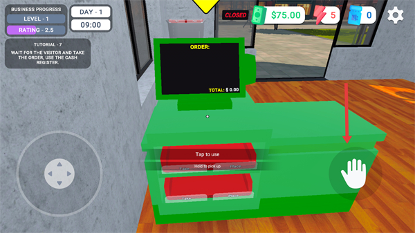 3、按【TAP-TO-USE】提示,操作收银台设备,准备处理顾客订单,推进店铺经营进度。