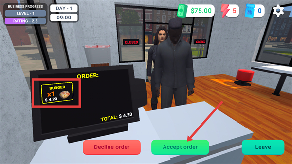 4、当订单显示【BURGER-x1-$4.20】时,点击【Accept-order】按钮接受订单,开始制作餐品完成经营任务。