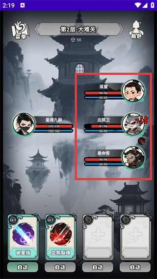 2、进入战斗后,对抗红色框内的道童、血炼卫、悬命客等敌人,使用技能卡牌击败他们。