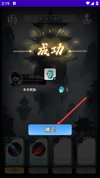 3、战斗成功后,点击【确定】按钮,领取本关奖励,获取资源道具。